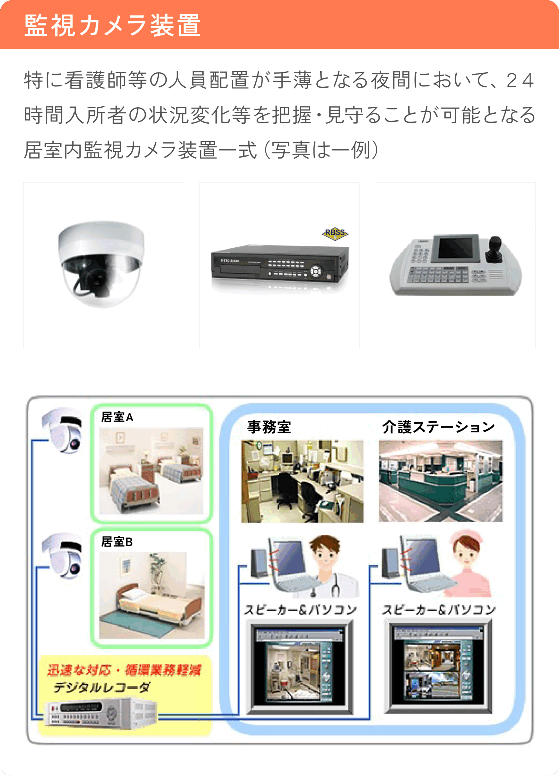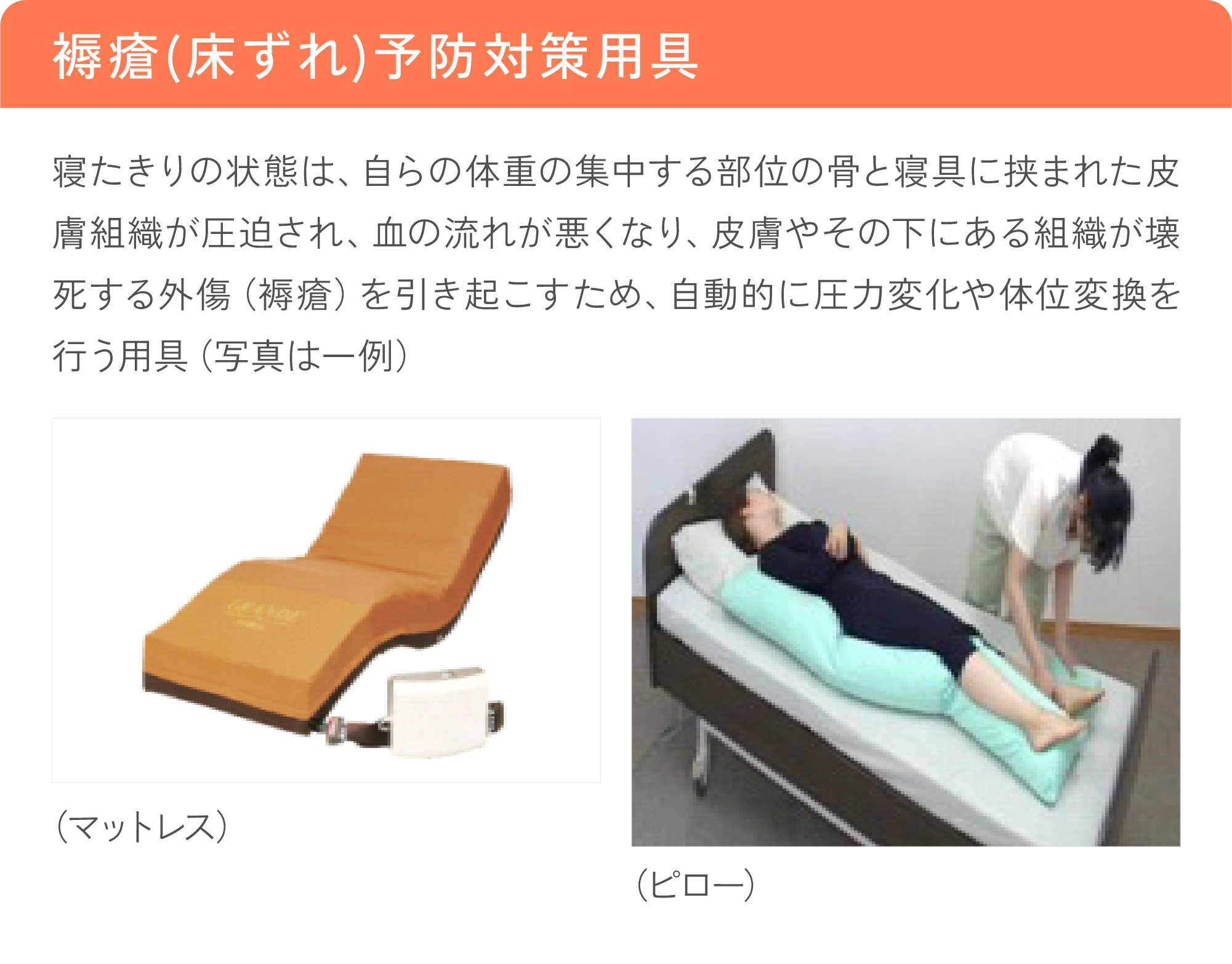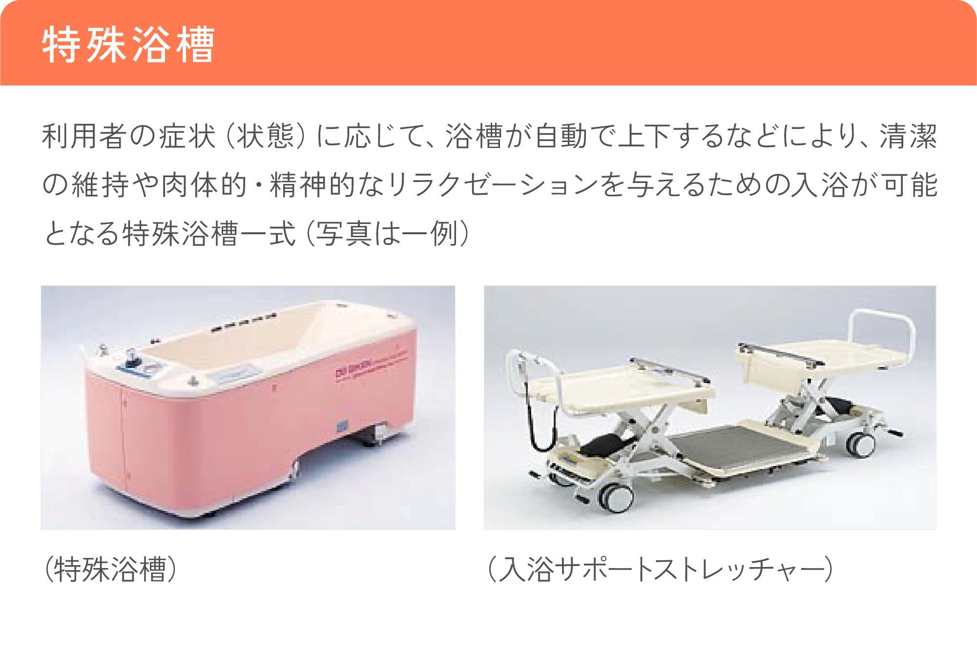 特殊浴槽/車椅子/介護用椅子/介護用ベッド/床ずれ予防対策用具/移乗・体位交換補助用具/移動用リフト/監視カメラ装置/意思伝達装置/痰吸引装置/特殊尿器/医用テレメーター/姿勢保持訓練器具/パルスオキシメーター/各種リハビリ機器